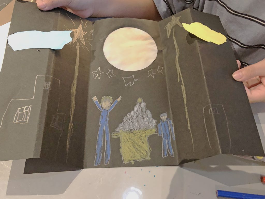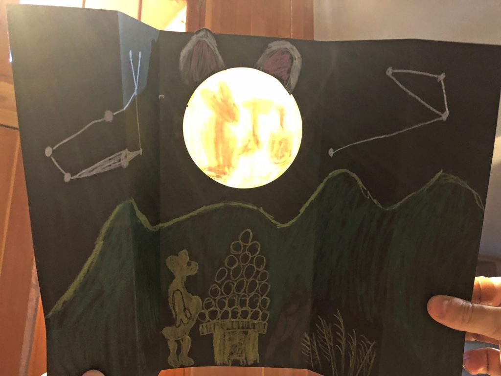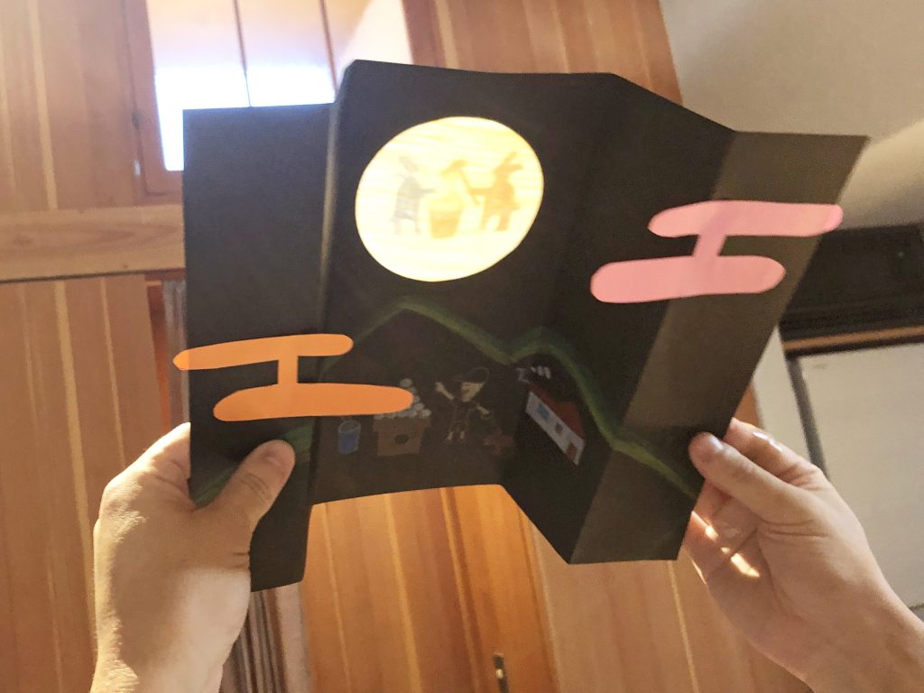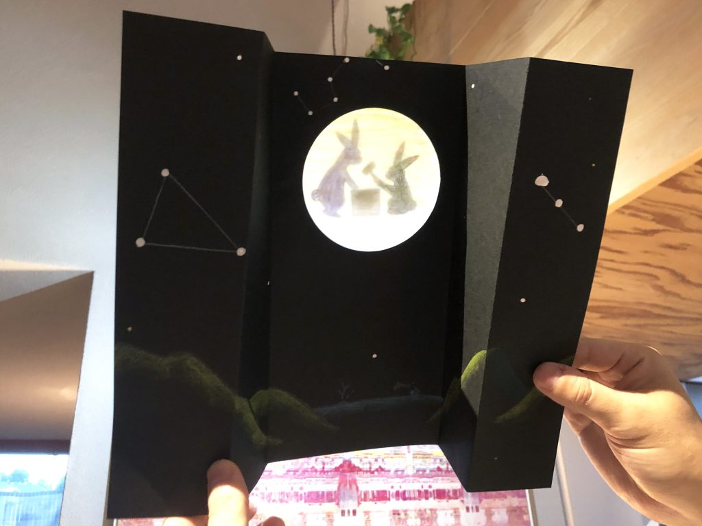 観音開きに折られた黒紙を開くと月が現れる、という仕掛け工作でした。