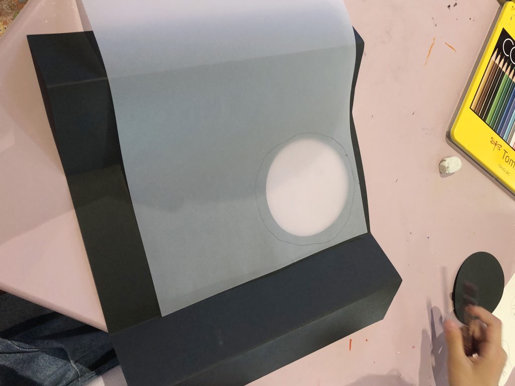 中央上部を円形カッターで丸く切りとり、重ねたトレーシングペーパーを裏から貼ります。