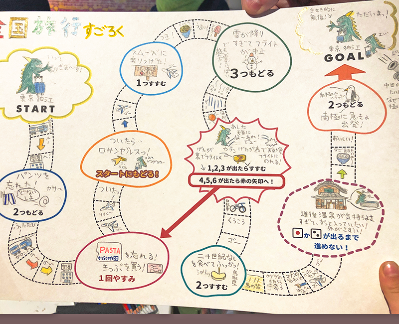 まいすごろく 投稿日: 2025年3月13日2025年3月13日 投稿者: Yukio Kaoru こんにちは。こまこまアートです。お正月遊び課題、2回目は「自分で作るすごろく」です。 ベースは我々で作り、子どもたちはそこに書き加える形ですごろくを作っていきます。結構、頭を使います!旅行すごろく、ポケモンすごろく、お料理すごろく、町探検すごろく・・・。それぞれの個性が出てとても面白いです。 サイコロも良いですが紙皿を使って「ルーレット」も作りました!皆とても素敵にできました。 おうちの人と楽しく遊んでね!
