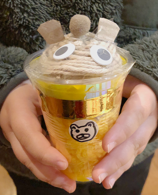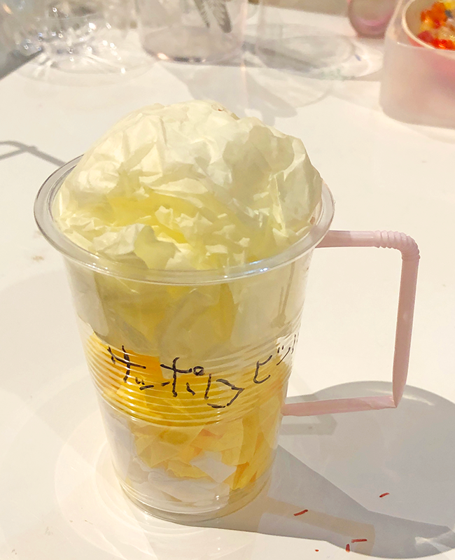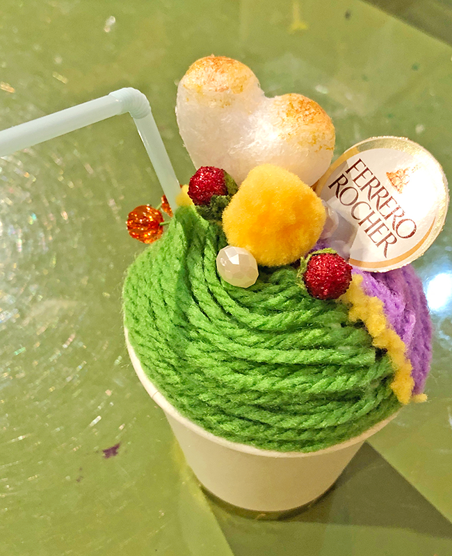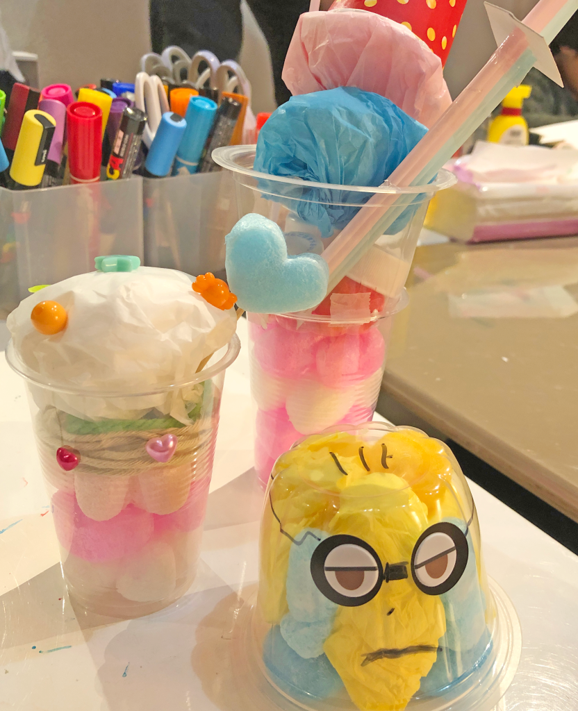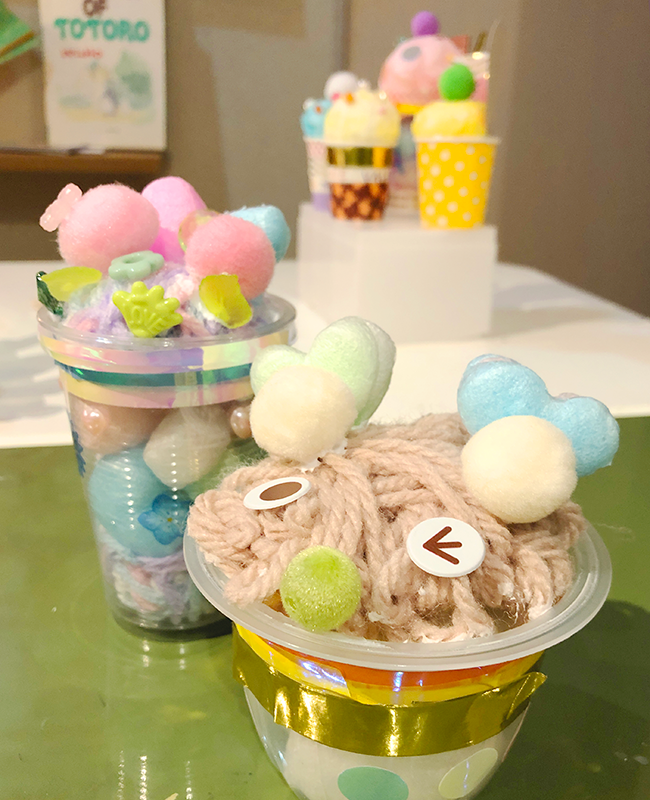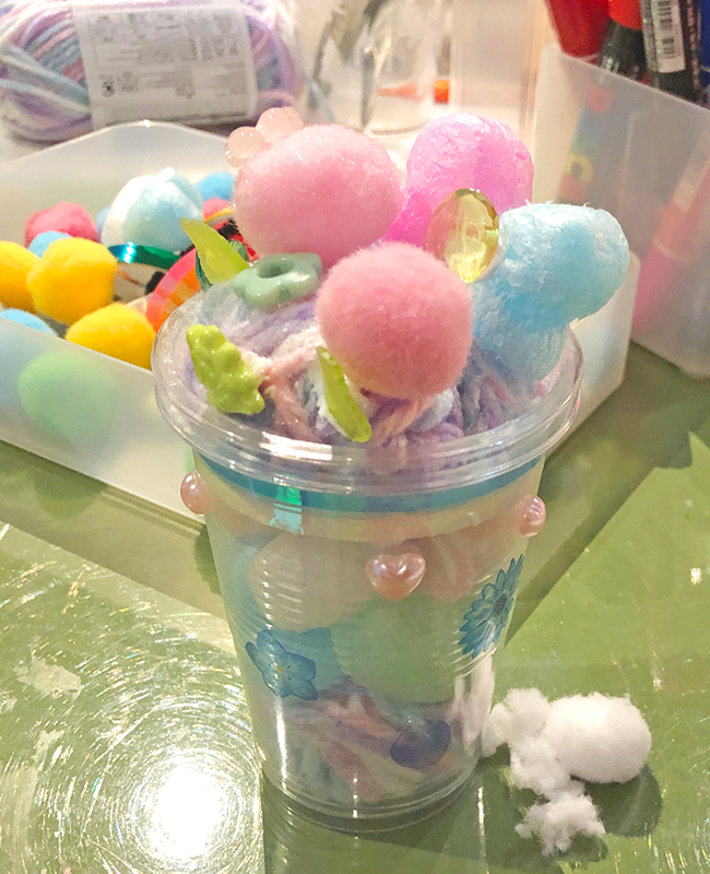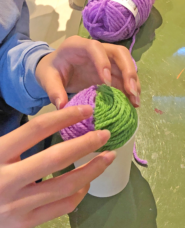 材料は毛糸、紙コップ、お花紙、ビーズ、そして100円ショップで手に入れた発泡スチロール、ポンポンなど♪