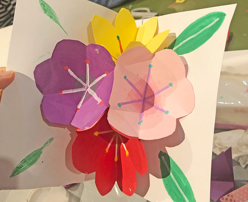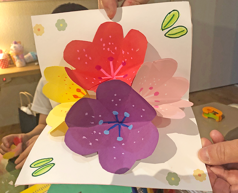 花形をさらにひと工夫して貼り合わせ、カードの中に挟むと・・・。花束が溢れるような、飛び出すカードの出来上がり!