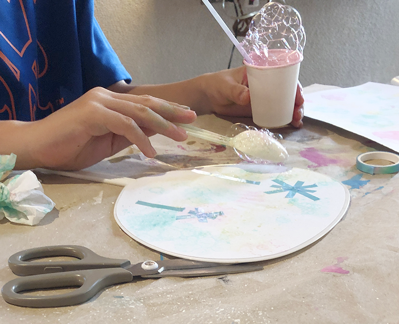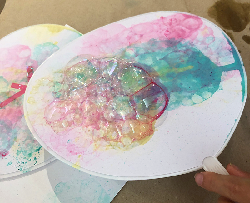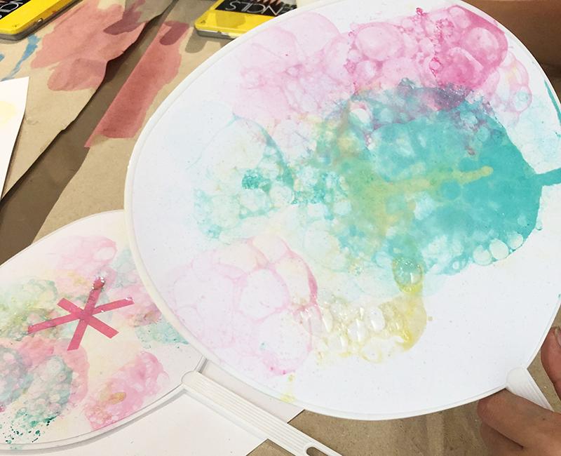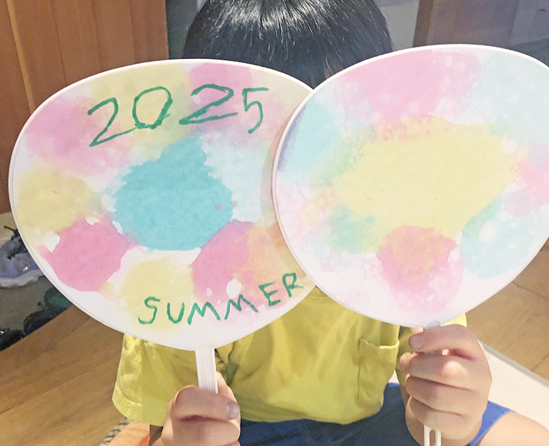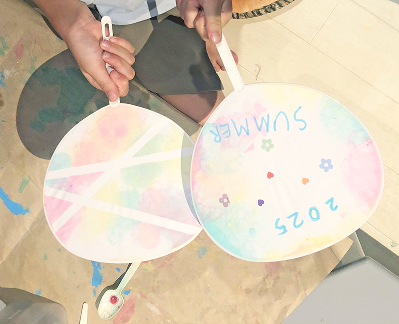 マイうちわ! 投稿日: 2025年12月14日2025年12月15日 投稿者: Yukio Kaoru こんにちは。こまこまアートです。8月の課題です。町内会の盆踊りで使える「マイ☆うちわ」を作りました。 絵の具入りの泡でブクブクさせ、模様を描いていきます。泡絵の具に子どもたちテンションアップ!とっても楽しかったね。